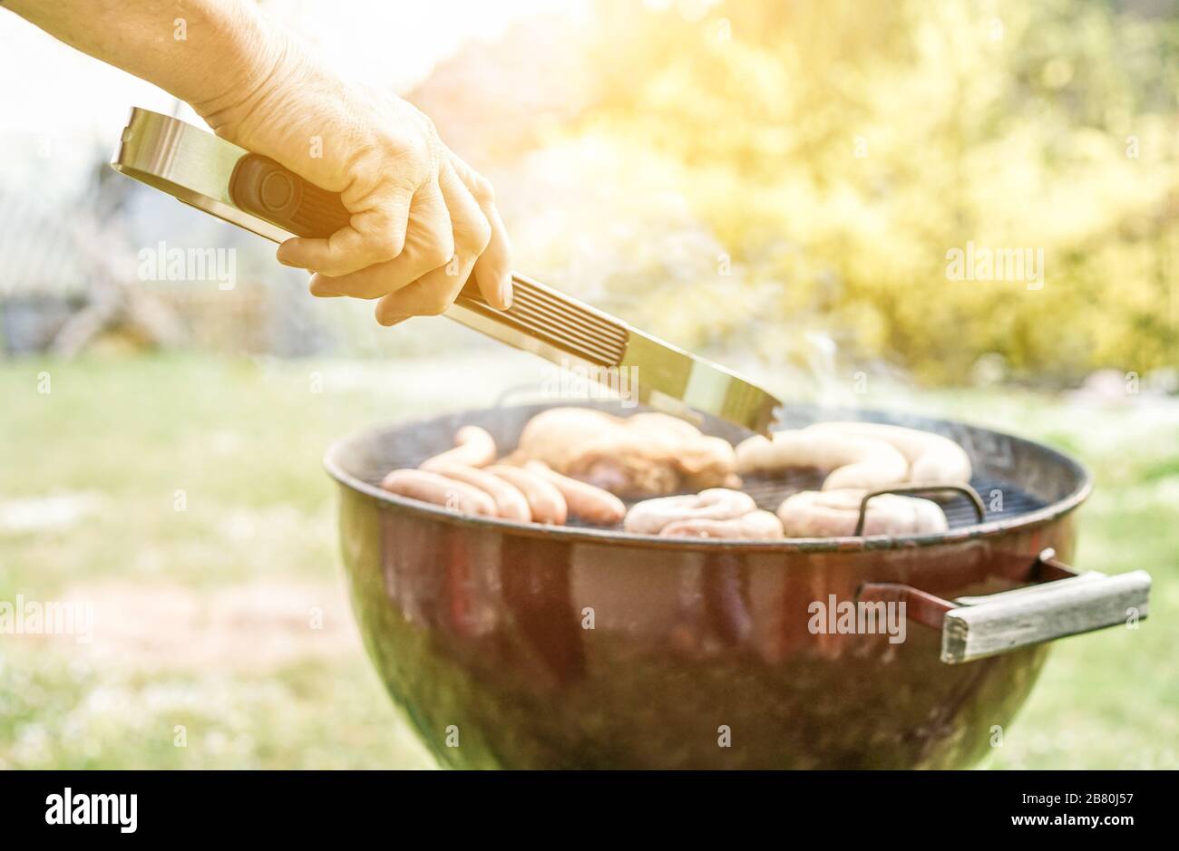 Mann Der Fleisch Auf Gartengrillparty Grillt Stockfotos Und Bilder Kaufen Alamy