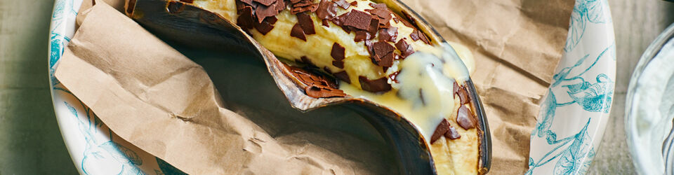 Die Banane einfach mit Schokolade füllen und auslöffeln. Auch Desserts und Nachspeisen lassen sich prima auf dem Grill zubereiten. Gemüse Fisch Fleisch dazu.