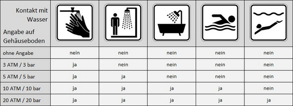 Die Wasserdichtigkeit kann auf einer Uhr in Metern Bar oder ATM angegeben sein. Tauglich für normales Schwimmen nicht aber für Tauchgänge dafür ist eine 5 ATM-Armbanduhr grundsätzlich qualifiziert für alle Oberflächen-Wassersportarten. Sie ist jedoch nicht zum Tauchen geeignet.
